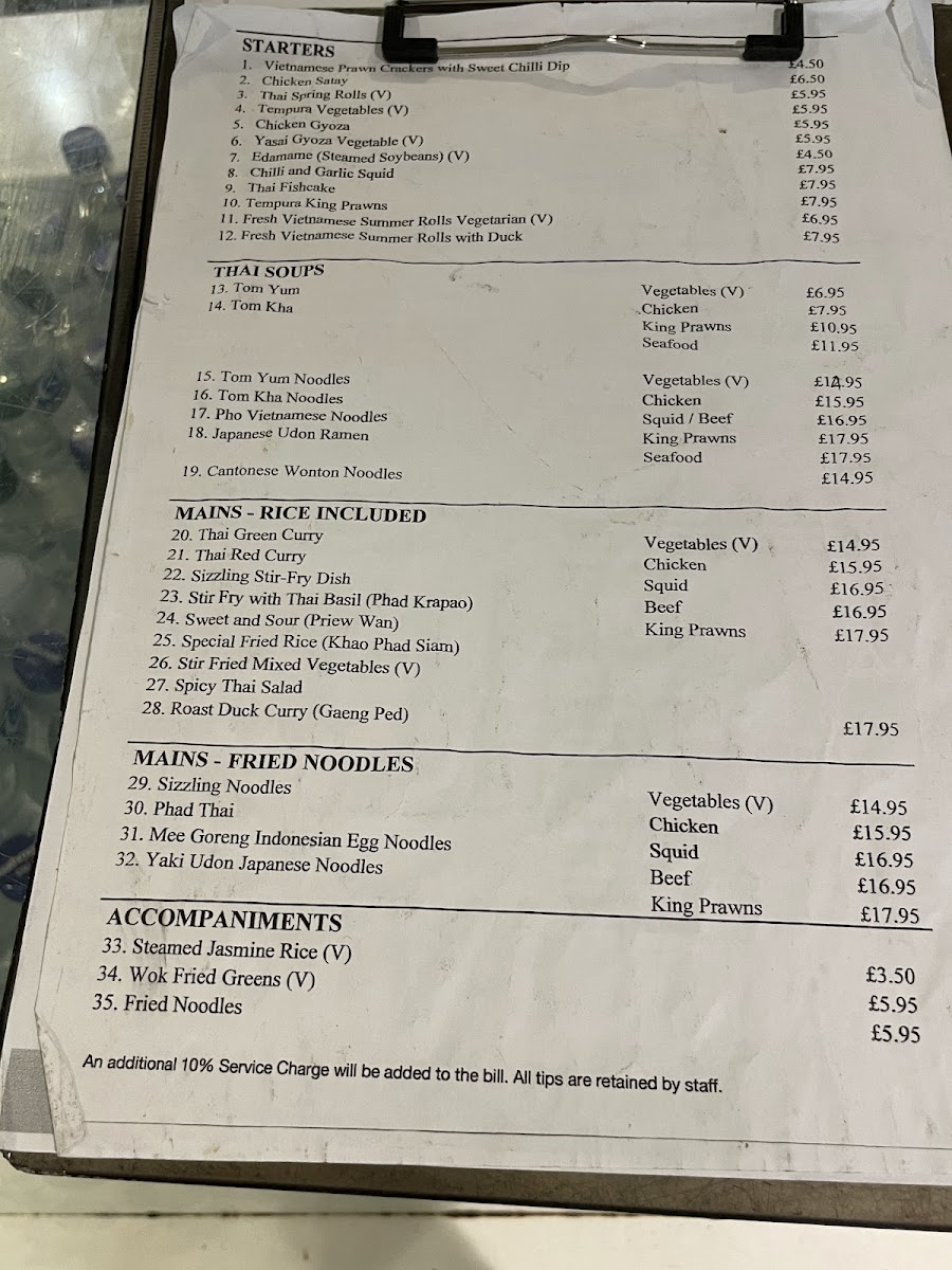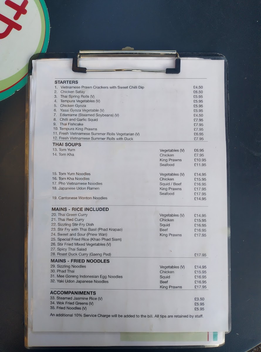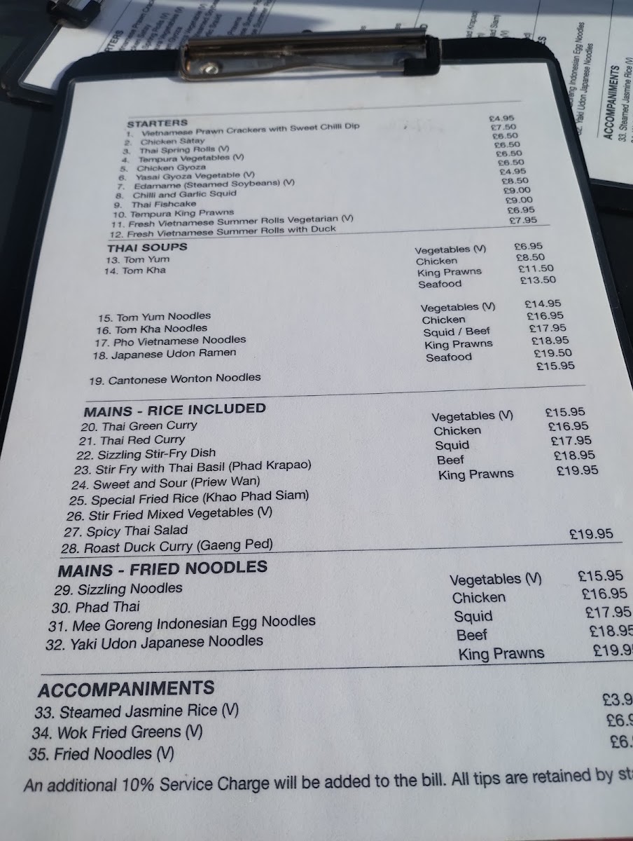 You’ll find familiar favourites such as fragrant Thai fried rice and delicately spiced red curry chicken alongside vibrant noodle stir-fries like yellow Pad Thai or sizzling vegetable noodles. Starters offer a mix of crispy and fresh options, from crunchy spring rolls and satay to tender chicken gyoza and veggie edamame, ideal for sharing or a gentle start to a meal.